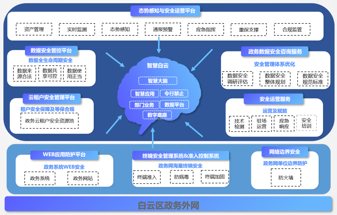 因此亟需開展“智慧白云”安全體系建設(shè)工作,需要統(tǒng)籌“智慧白云”各子系統(tǒng)架構(gòu)與數(shù)據(jù)的安全邊界,以“安全、合規(guī)、可控”為實(shí)現(xiàn)目標(biāo),從管理機(jī)制、技術(shù)保障、安全運(yùn)營等角度去構(gòu)建立體化縱深防御體系,護(hù)航“智慧白云”體系和白云區(qū)政府?dāng)?shù)字化的健康發(fā)展。對此,安恒信息深度參與“智慧白云”安全體系建設(shè),共同筑牢白云區(qū)數(shù)字政府網(wǎng)絡(luò)安全防線。