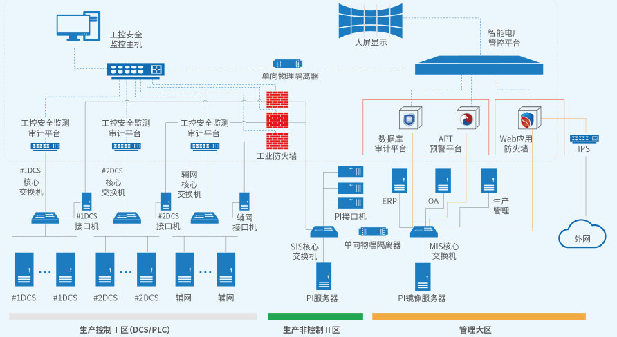 o?實現(xiàn)生產(chǎn)大區(qū)工控安全防護 >>>>?在生產(chǎn)大區(qū)部署工控安全防護產(chǎn)品,提高工控系統(tǒng)在邊界隔離、入侵檢測及安全審計等方面的防護能力