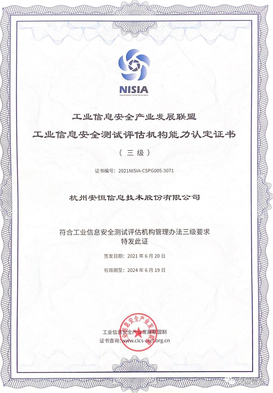 獲工業(yè)信息安全測(cè)試評(píng)估機(jī)構(gòu)能力三級(jí)認(rèn)定。
