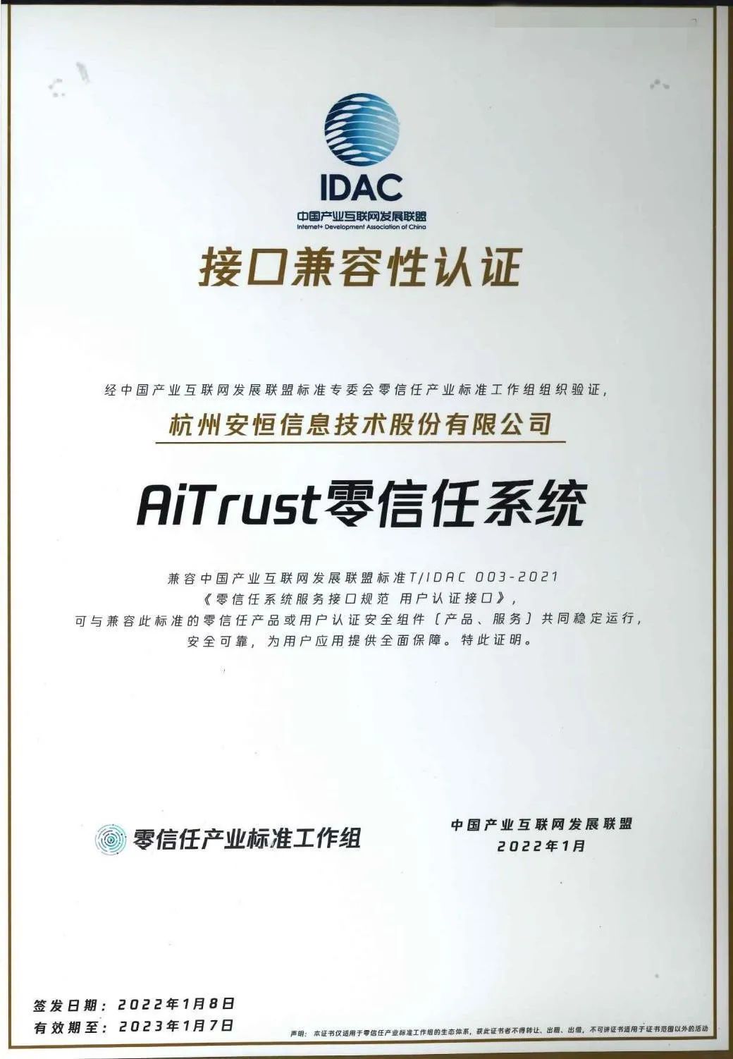 2022年1月,經(jīng)中國(guó)產(chǎn)業(yè)互聯(lián)網(wǎng)發(fā)展聯(lián)盟(IDAC)標(biāo)準(zhǔn)專委會(huì)零信任產(chǎn)業(yè)標(biāo)準(zhǔn)工作組組織驗(yàn)證,安恒信息AiTrust零信任系統(tǒng)獲得IDAC接口兼容性認(rèn)證。