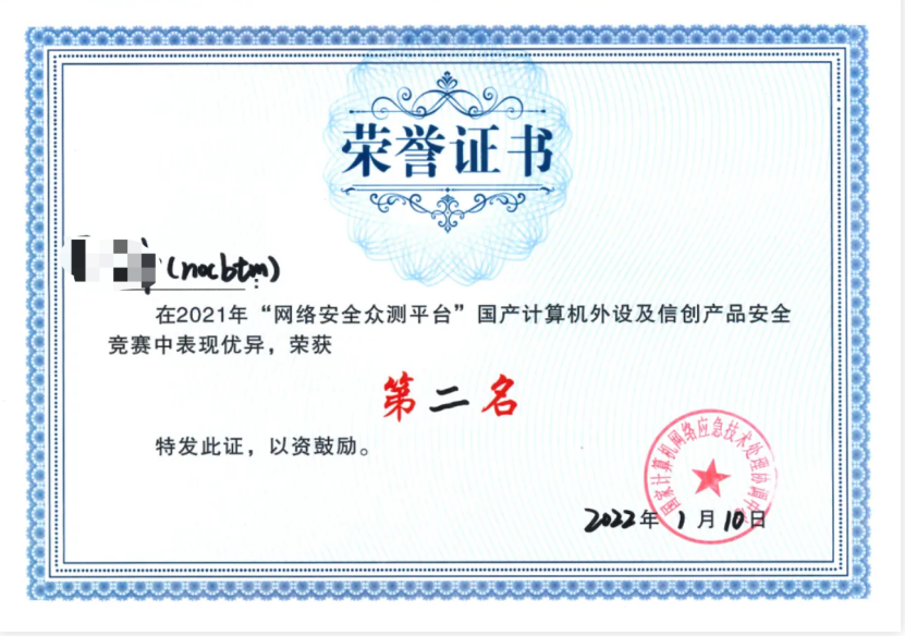 近日,在國家計(jì)算機(jī)網(wǎng)絡(luò)應(yīng)急技術(shù)處理協(xié)調(diào)中心主辦的“網(wǎng)絡(luò)安全眾測平臺”國產(chǎn)計(jì)算機(jī)外設(shè)及信創(chuàng)產(chǎn)品安全競賽活動中,安恒信息位列安全廠商漏洞總積分第二名,榮獲主辦方頒發(fā)的“優(yōu)秀組織獎”榮譽(yù)證書;安恒信息海特實(shí)驗(yàn)室安全研究員“nocbtm”憑借出色表現(xiàn)獲得測試人員漏洞總積分第二名。