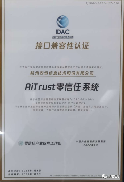 AiTrust零信任系統(tǒng)獲得IDAC接口兼容性認(rèn)證,該認(rèn)證是國內(nèi)目前唯一的零信任接口認(rèn)證,標(biāo)志著安恒信息AiTrust零信任系統(tǒng)開放兼容、標(biāo)準(zhǔn)對接的能力受第三方認(rèn)可,可與兼容此標(biāo)準(zhǔn)的零信任或用戶認(rèn)證安全組件(產(chǎn)品、服務(wù))共同穩(wěn)定運行、安全可靠,為用戶應(yīng)用提供全面保障。