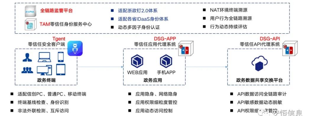 基于零信任理念,該方案采取終端基線檢查、終端識別、用戶認(rèn)證、權(quán)限管控等技術(shù)手段,構(gòu)建構(gòu)建基于政務(wù)終端、政務(wù)應(yīng)用、政務(wù)數(shù)據(jù)共享交換平臺的全鏈路防護(hù)及監(jiān)管體系,實現(xiàn)“全程可控”。