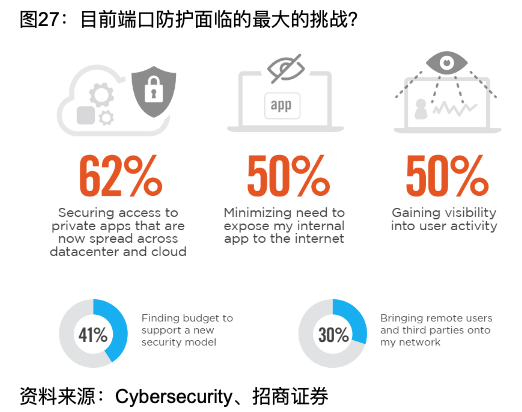 目前端口防護(hù)面臨最大的安全挑戰(zhàn)是什么?據(jù)Cybersecurity數(shù)據(jù),62%的企業(yè)認(rèn)為,是保護(hù)重點(diǎn)在于對(duì)當(dāng)下分布在數(shù)據(jù)中心和云上的私有應(yīng)用的訪問;50%的企業(yè)認(rèn)為,需要縮小面向互聯(lián)網(wǎng)開放的內(nèi)部應(yīng)用程序;50%的企業(yè)認(rèn)為,需要強(qiáng)化捕捉用戶內(nèi)部活動(dòng)的能力。