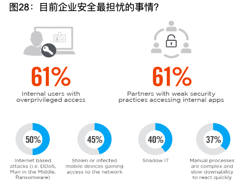 目前企業(yè)內(nèi)部安全最擔(dān)憂的問題包括:具有超特權(quán)訪問權(quán)限的內(nèi)部用戶;安全措施薄弱的合作伙伴訪問內(nèi)部應(yīng)用程序。主要的威脅來(lái)自:基于互聯(lián)網(wǎng)的攻擊(即DDoS、MITM攻擊:中間人攻擊、勒索攻擊);被盜或受感染的移動(dòng)設(shè)備進(jìn)入網(wǎng)絡(luò);影子IT;過于緩慢的手動(dòng)處置,造成更多的安全問題無(wú)法及時(shí)得到響應(yīng)。