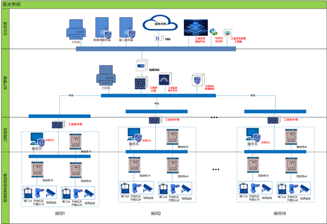 為確保水利業(yè)務(wù)能穩(wěn)定安全地開展,山東省某水利工程啟動(dòng)“工控安全等級(jí)保護(hù)三級(jí)建設(shè)項(xiàng)目”,對(duì)轄區(qū)內(nèi)某河流主河道上的水閘遠(yuǎn)程控制和現(xiàn)地控制兩個(gè)層級(jí)進(jìn)行加固,建立工業(yè)信息安全整體安全防護(hù)體系,保障業(yè)務(wù)穩(wěn)定有序開展。