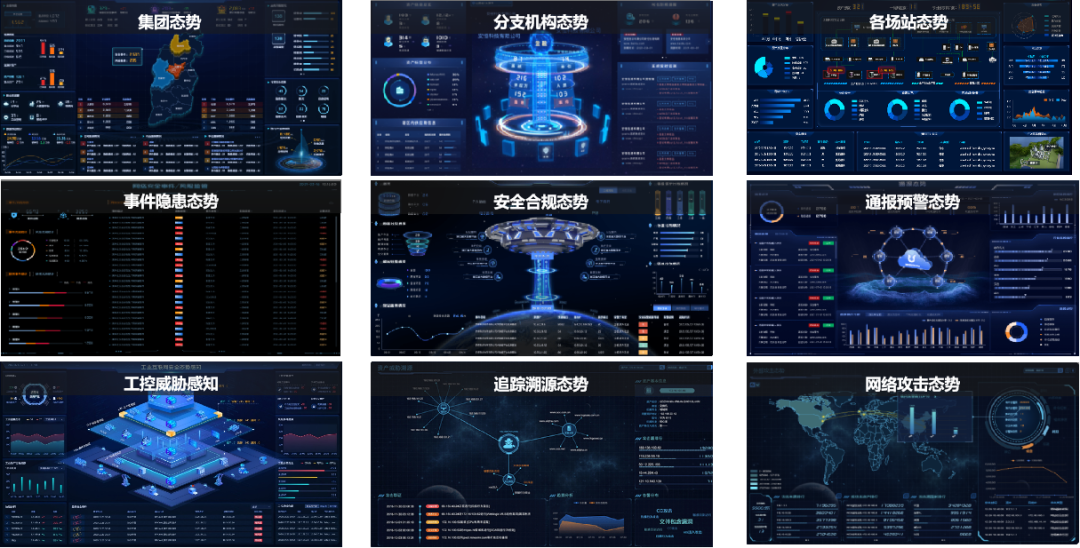 平臺(tái)對(duì)底層監(jiān)測審計(jì)、工業(yè)防火墻、主機(jī)防護(hù)等設(shè)備的日志與告警信息進(jìn)行實(shí)時(shí)獲取和歸類整理,將安全告警信息、各類攻擊行為與信息、網(wǎng)絡(luò)威脅信息進(jìn)行統(tǒng)一集中展示,形成綜合態(tài)勢、攻擊態(tài)勢、威脅態(tài)勢、預(yù)警態(tài)勢等多種態(tài)勢感知能力,為某水利工程領(lǐng)導(dǎo)提供工業(yè)網(wǎng)絡(luò)安全決策及應(yīng)急防護(hù)提供依據(jù)。