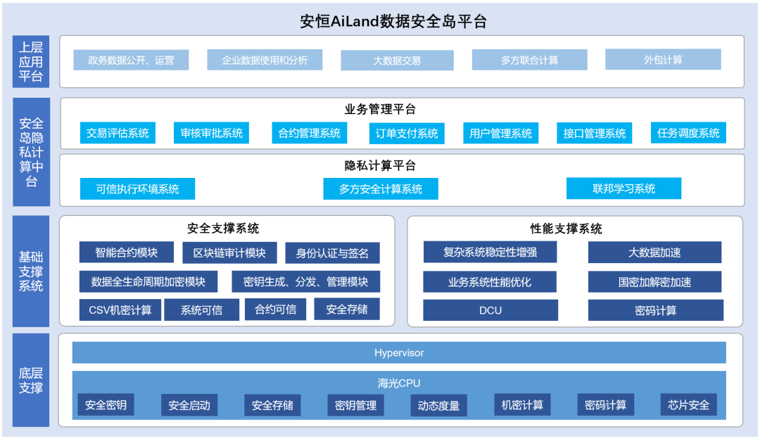 安全島隱私計(jì)算一體機(jī)基于海光CPU的架構(gòu)設(shè)計(jì)包括安全支撐系統(tǒng)和性能支撐系統(tǒng),給安全島隱私計(jì)算中臺(tái)及上層應(yīng)用平臺(tái)提供了安全性,性能及穩(wěn)定性上的支撐。