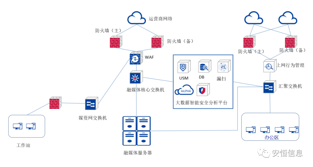 隨著廣電融媒體迅速發(fā)展建設(shè),網(wǎng)絡(luò)風(fēng)險與暗潮也隨之涌來。手機臺、公眾號、APP、網(wǎng)站等媒體平臺,甚至我們認(rèn)為壁壘堅固的制播內(nèi)網(wǎng)都將受到互聯(lián)網(wǎng)外來病毒的攻擊,如果網(wǎng)絡(luò)不能全面有效地保護(hù)起來,一旦遭受攻擊勢必將嚴(yán)重影響融媒體的正常運行,并且對公共宣傳造成不可挽回的損失,后果不堪設(shè)想。面對融媒體建設(shè)亟待解決的難題,安恒信息與某地市級廣播電視臺展開合作,全方位構(gòu)筑融媒體網(wǎng)絡(luò)安全之墻。