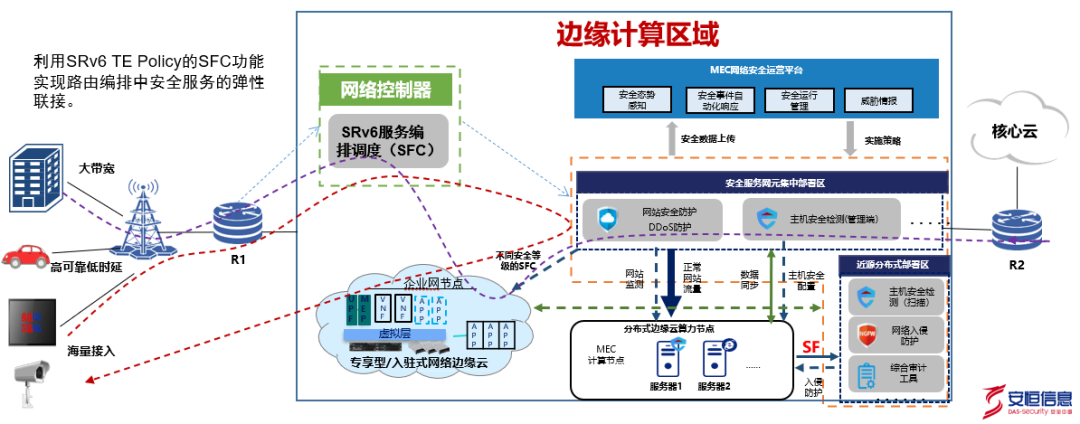 三是流量調(diào)度,通過控制網(wǎng)絡(luò)流量,牽引或鏡像流量至安全設(shè)備完成網(wǎng)絡(luò)流量防護形成安全服務(wù)鏈。