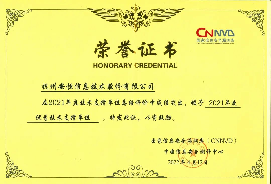 自2014年成為首批入選國(guó)家信息安全漏洞一級(jí)支撐單位的廠商以來(lái),安恒信息積極為CNNVD提交重要數(shù)據(jù)漏洞,多年來(lái),憑借實(shí)力和豐富經(jīng)驗(yàn)先后獲得來(lái)自CNNVD的多項(xiàng)榮譽(yù)。2021年,安恒信息榮獲CNNVD頒發(fā)的“2021年度特殊貢獻(xiàn)獎(jiǎng)”和“2021年度優(yōu)秀技術(shù)支撐單位”,不斷支持國(guó)家漏洞庫(kù)的建設(shè),助力信息安全漏洞研究。