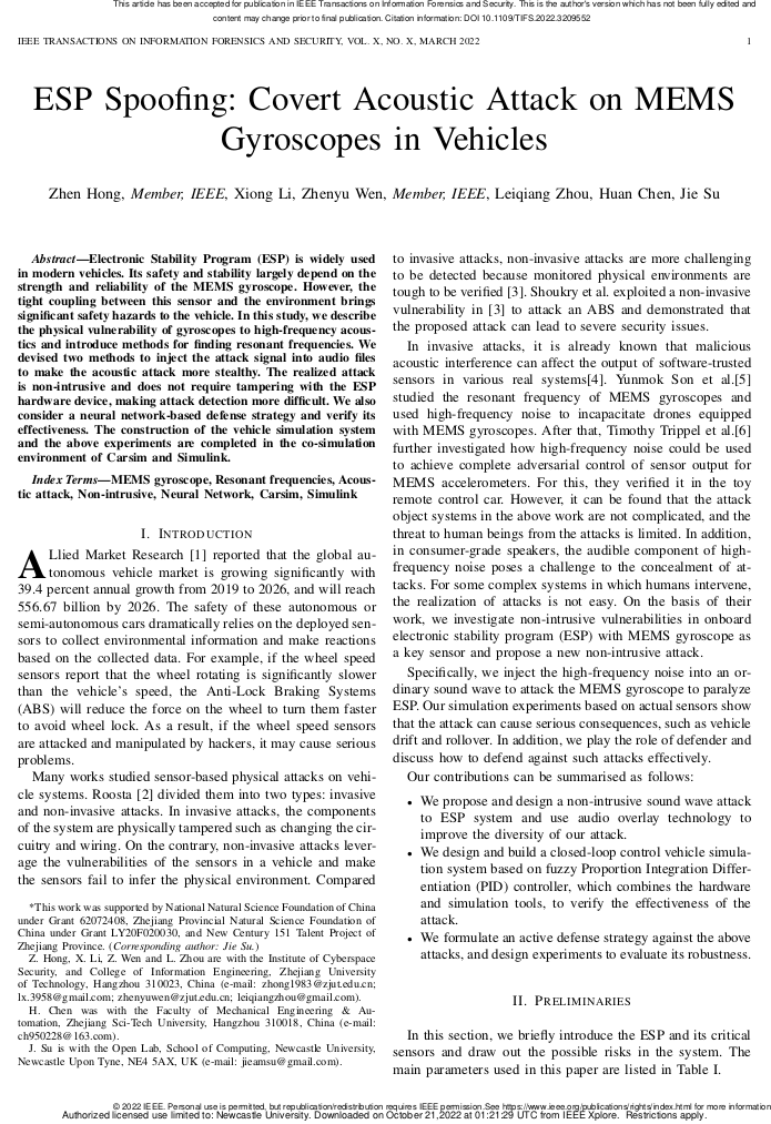 近日,由安恒信息中央研究院與浙江工業(yè)大學(xué)聯(lián)合研究成果“ESP Spoofing: Covert Acoustic Attack on MEMS Gyroscopes in Vehicles”,被信息安全領(lǐng)域國際頂級(jí)學(xué)術(shù)期刊IEEE Transactions on Information Forensics & Security錄用并在線發(fā)表。