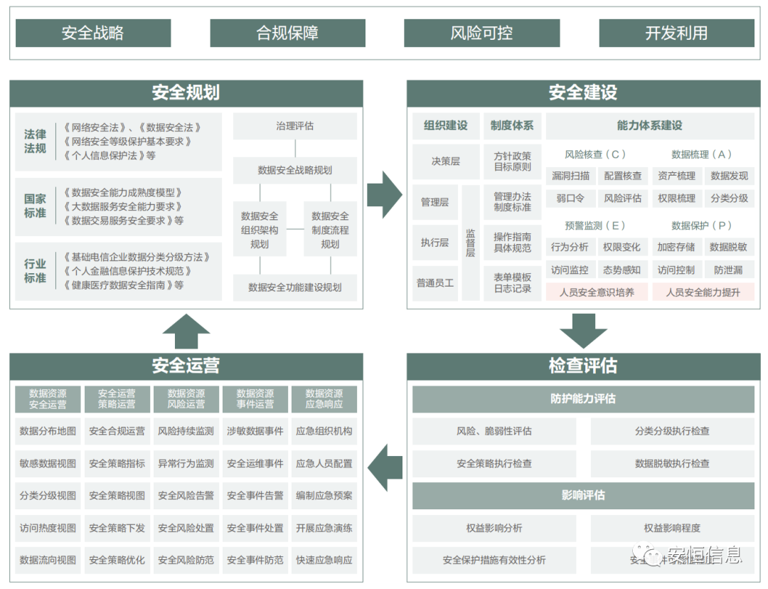 安恒信息數(shù)據(jù)安全治理體系框架包含:安全規(guī)劃、安全建設(shè)、檢查評估和安全運營四個方面。