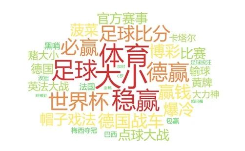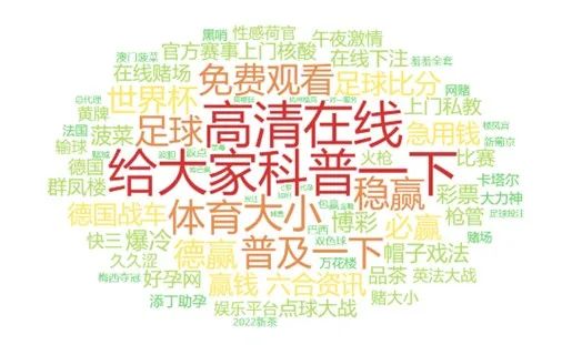 近期世界杯相關(guān)關(guān)鍵詞出現(xiàn)情況進(jìn)行了詞頻統(tǒng)計(jì)如圖13,涉及內(nèi)容主要以輸贏、比分、體育以及球隊(duì),球星和部分經(jīng)典比賽為主。從內(nèi)容分析主要以最新的球賽消息吸引眼球,誘導(dǎo)用戶進(jìn)入博彩網(wǎng)站。