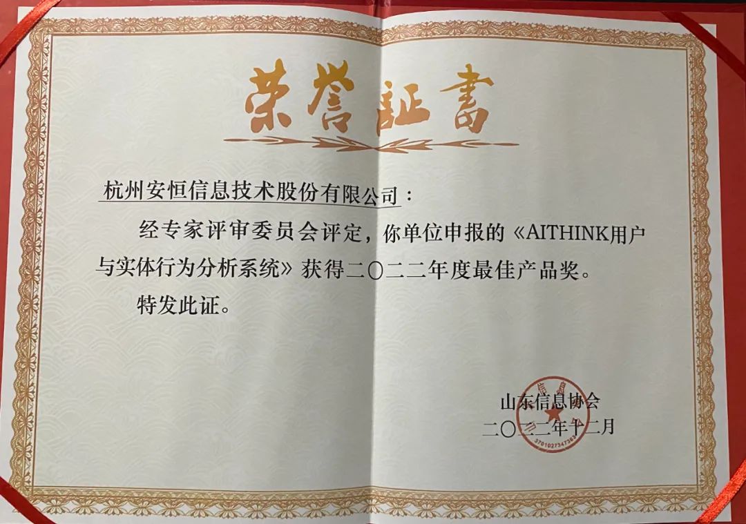現(xiàn)場,安恒信息被評為最具影響力企業(yè),其《AiThink用戶與實(shí)體行為分析系統(tǒng)》及《數(shù)盾數(shù)據(jù)安全解決方案》分別榮獲2022年山東省網(wǎng)絡(luò)安全行業(yè)最佳產(chǎn)品獎和最佳解決方案獎。