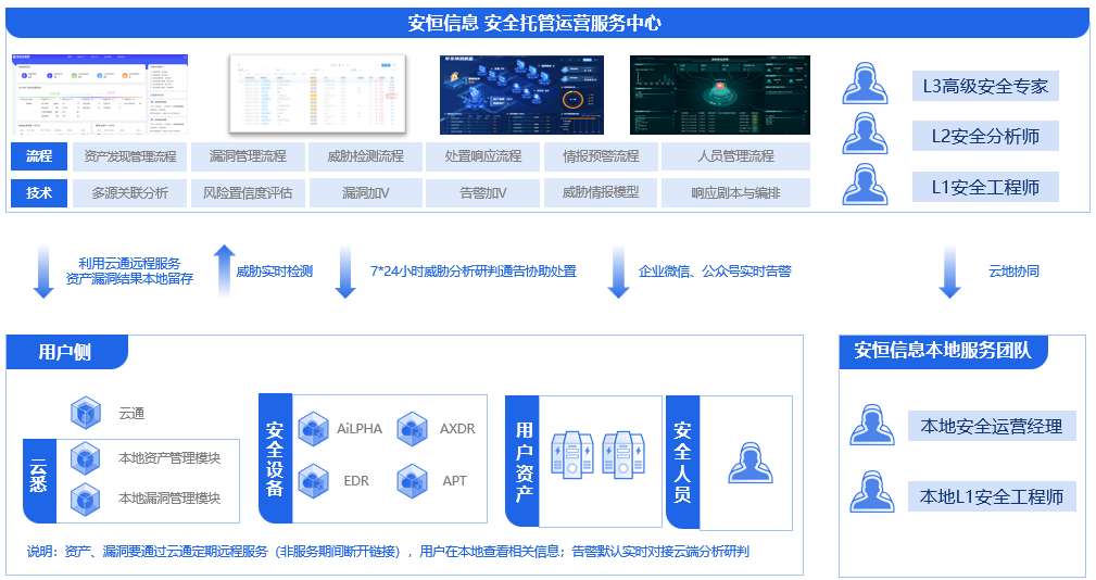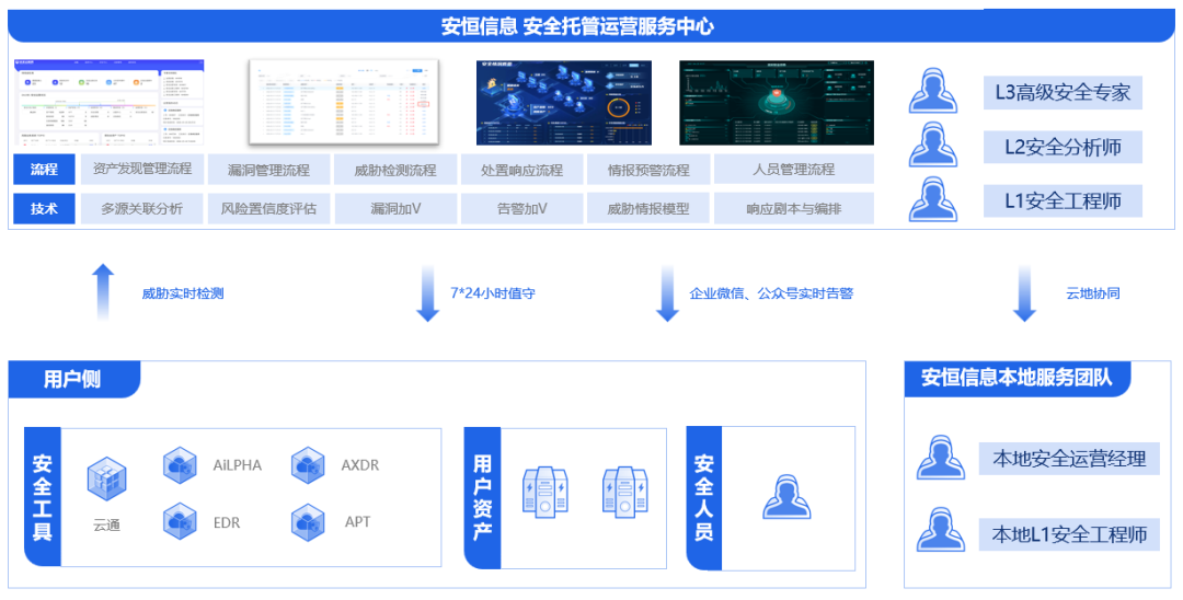 7*24小時在線的云端三級安全運營專家以及分布在全國各城市的本地服務團隊,通過云端托管運營服務平臺實現用戶側安恒邊界、流量、終端設備的托管,并按照資產發(fā)現、暴露面檢測、互聯網漏洞掃描與管理、威脅實時檢測響應等運營流開展工作。