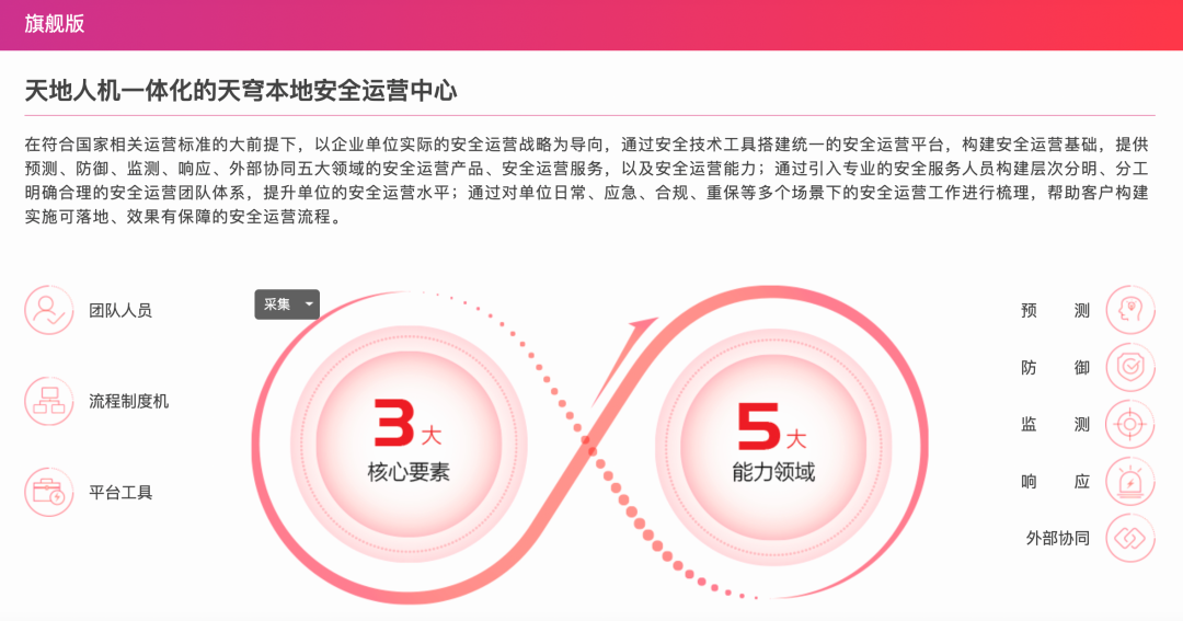 在符合國家相關運營標準的大前提下,以企業(yè)單位實際的安全運營戰(zhàn)略為導向,通過安全技術工具搭建統一的安全運營平臺,構建安全運營基礎,提供預測、防御、監(jiān)測、響應、外部協同五大領域的安全運營產品、安全運營服務,以及安全運營能力;通過引入專業(yè)的安全服務人員構建層次分明、分工明確合理的安全運營團隊體系,提升單位的安全運營水平;通過對單位日常、應急、合規(guī)、重保等多個場景下的安全運營工作進行梳理,幫助用戶構建實施可落地、效果有保障的安全運營流程。