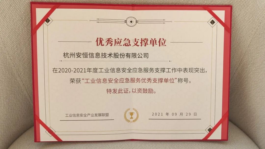 2020-2021年度工業(yè)信息安全應急服務優(yōu)秀支撐單位證書