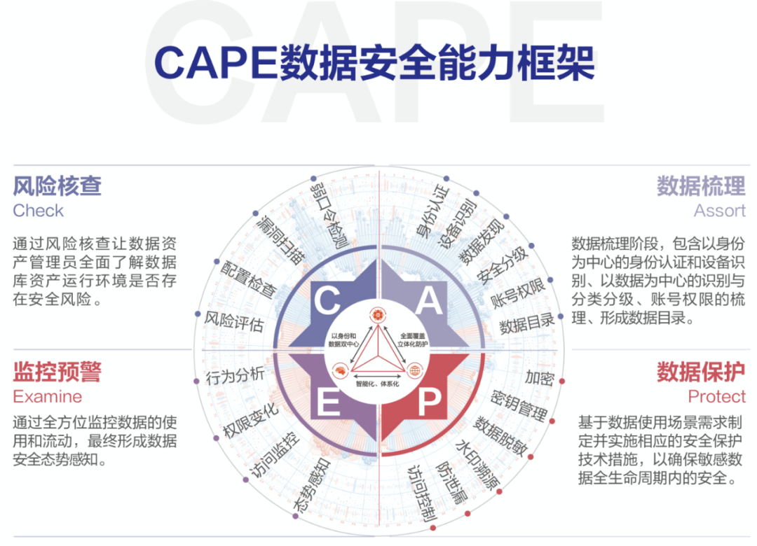 數(shù)據(jù)安全技術(shù)體系:構(gòu)建風(fēng)險(xiǎn)核查(Check)、數(shù)據(jù)梳理(Assort)、數(shù)據(jù)保護(hù)(Protect)以及數(shù)據(jù)威脅監(jiān)控預(yù)警(Examine)四位一體的數(shù)據(jù)安全技術(shù)體系,實(shí)現(xiàn)對(duì)數(shù)據(jù)采集、傳輸、存儲(chǔ)、處理、交換、銷(xiāo)毀全生命周期的安全管理和防護(hù)。