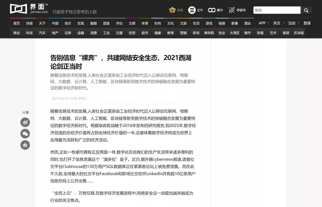 界面新聞|告別信息“裸奔”,共建網(wǎng)絡(luò)安全生態(tài),2021西湖論劍正當(dāng)時(shí)