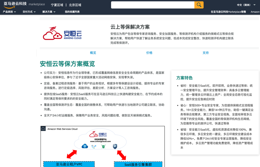 自2019年起,安恒信息云安全與亞馬遜科技展開全面合作,2021年,安恒云在線SaaS訂閱服務入駐亞馬遜科技marketplace,是首批入駐的SaaS解決方案,也是唯一一個SaaS云安全解決方案。安恒云等保解決方案也是亞馬遜marketplace等保2.0解決方案推薦解決方案之一。