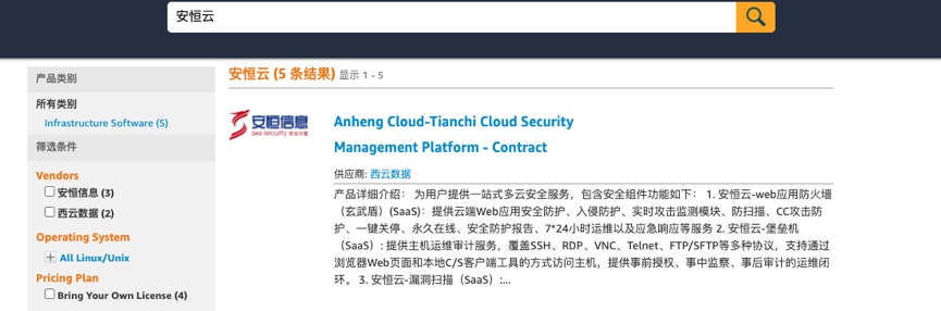 通過亞馬遜市場搜索【安恒云】即可查到安恒云在線SaaS訂閱服務。