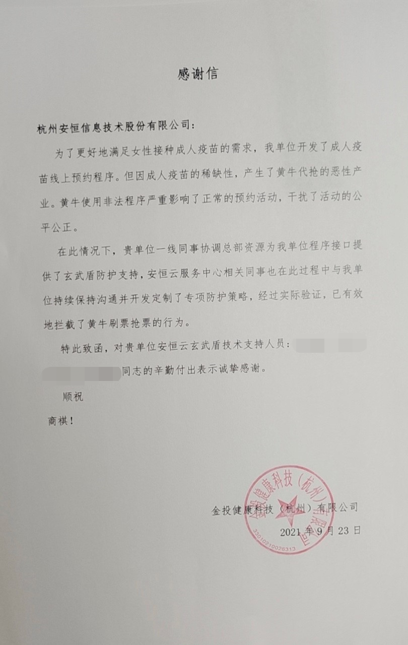 數(shù)據(jù)顯示,未使用云防護(hù)前每次預(yù)約放號,被黃牛搶走的比例在60%-80%,真正的用戶很難預(yù)約到疫苗。自 “疫苗預(yù)約系統(tǒng)云安全項(xiàng)目”上線以來,金投健康完成5次疫苗預(yù)約放號活動,單次疫苗預(yù)約活動中接收到請求40萬+,通過UID識別阻斷請求14.8萬,直接阻擋黑客攻擊4100次;150預(yù)約名額經(jīng)排查驗(yàn)證正常用戶為147人,黃牛搶購行為大大降低 ,保障了活動的公平公正。