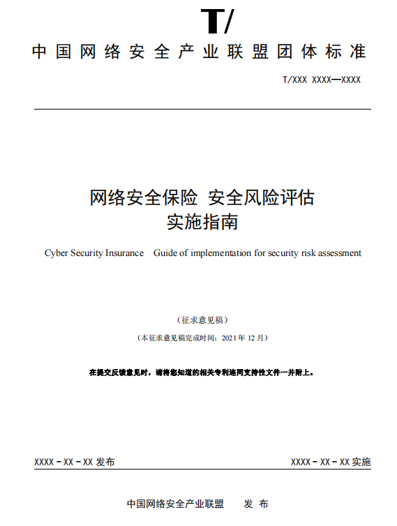 2021年12月24日,中國(guó)網(wǎng)絡(luò)安全產(chǎn)業(yè)聯(lián)盟發(fā)布通知,由杭州安恒信息技術(shù)股份有限公司牽頭制定的《網(wǎng)絡(luò)安全保險(xiǎn) 安全風(fēng)險(xiǎn)評(píng)估實(shí)施指南》聯(lián)盟標(biāo)準(zhǔn)已完成征求意見(jiàn)稿,進(jìn)入為期一個(gè)月的征求意見(jiàn)階段。