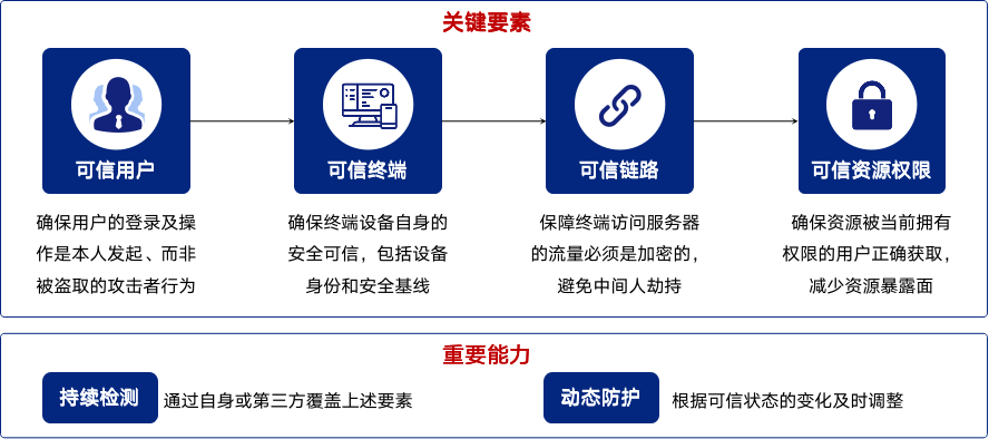 此背景下,零信任被提出來,其核心原則是“Trust no-one. Verify everything”,提倡以身份為邊界作為權(quán)限管控的基礎(chǔ)。進(jìn)一步講,就是零信任認(rèn)為企業(yè)不應(yīng)該自動信任內(nèi)部或外部的任何人/事/物,應(yīng)在授權(quán)前通過動態(tài)和持續(xù)的身份認(rèn)證和評估機(jī)制,對網(wǎng)絡(luò)環(huán)境中的訪問主體人和設(shè)備的危險等級進(jìn)行科學(xué)準(zhǔn)確判定,采用最小特權(quán)訪問策略,嚴(yán)格執(zhí)行訪問控制,提升所有網(wǎng)絡(luò)實體連接之間的可信關(guān)系,增加企業(yè)安全保障。