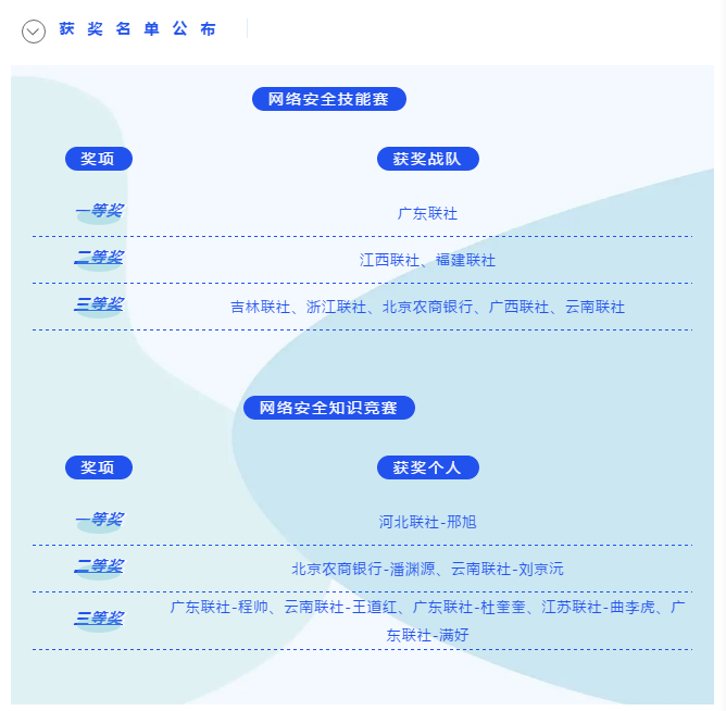 集結農信系統(tǒng)網(wǎng)安力量,構筑金融行業(yè)安全防線,來自31支農信機構參賽隊伍,在這個冬季“燃起戰(zhàn)火”,經(jīng)過激烈比拼,最終“廣東聯(lián)社”戰(zhàn)隊拔得頭籌,榮獲網(wǎng)絡安全技能競賽團隊一等獎,“河北聯(lián)社-邢旭”在網(wǎng)絡安全知識競賽中脫穎而出榮獲冠軍。