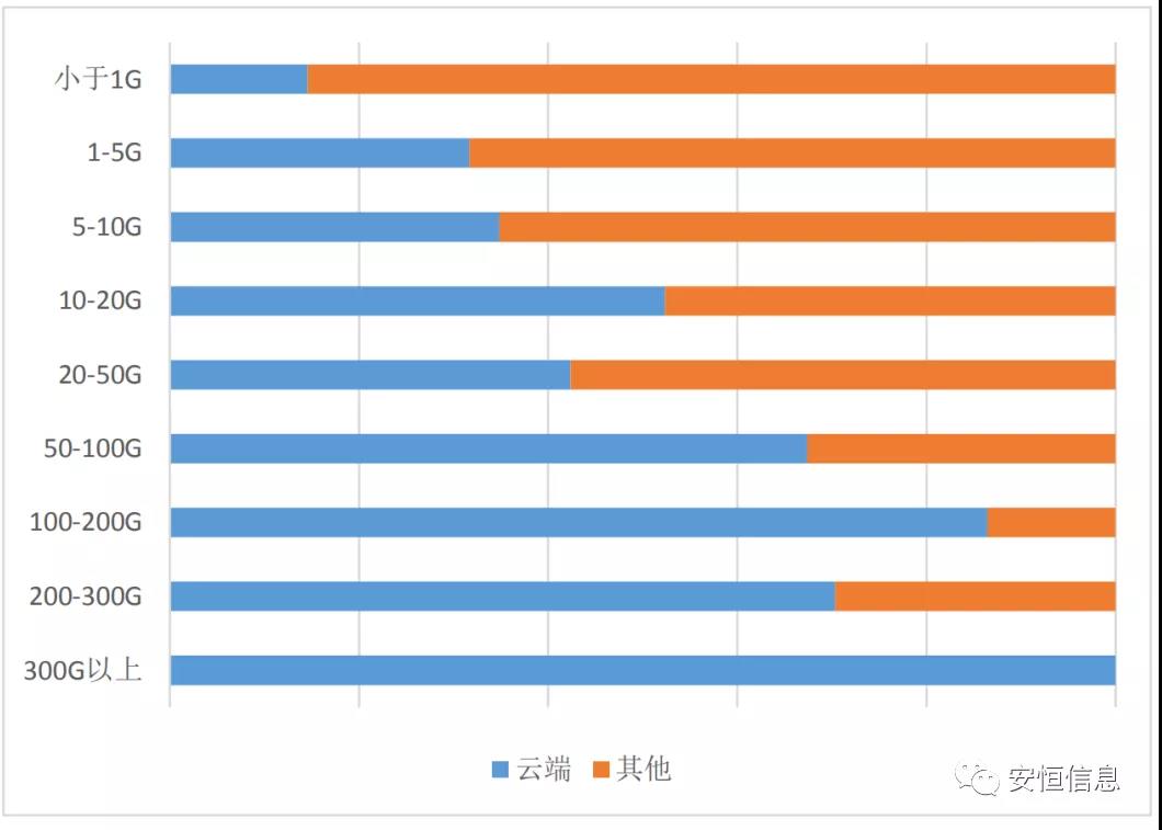 云計算技術(shù)的諸多優(yōu)點(diǎn)使得云服務(wù)得以廣泛應(yīng)用,越多來越多的用戶將業(yè)務(wù)遷移至云端,云端的流量也越來越大,但這也被大流量DDoS攻擊所利用。從各流量區(qū)間分布來看,在大流量攻擊中,攻擊主力來自云端。