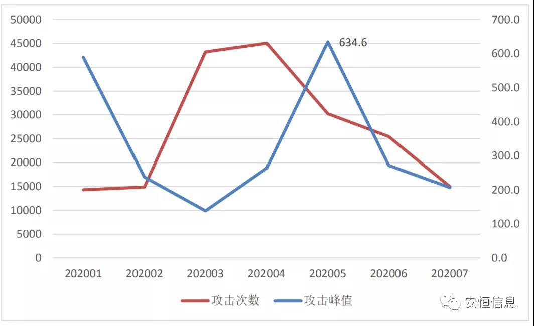 從上半年各月來看,云端攻擊源數(shù)量逐月上升,從攻擊次數(shù)來看,3/4月份為云端DDoS攻擊高峰,從攻擊峰值來看,5月峰值最高為634.6Gbps。