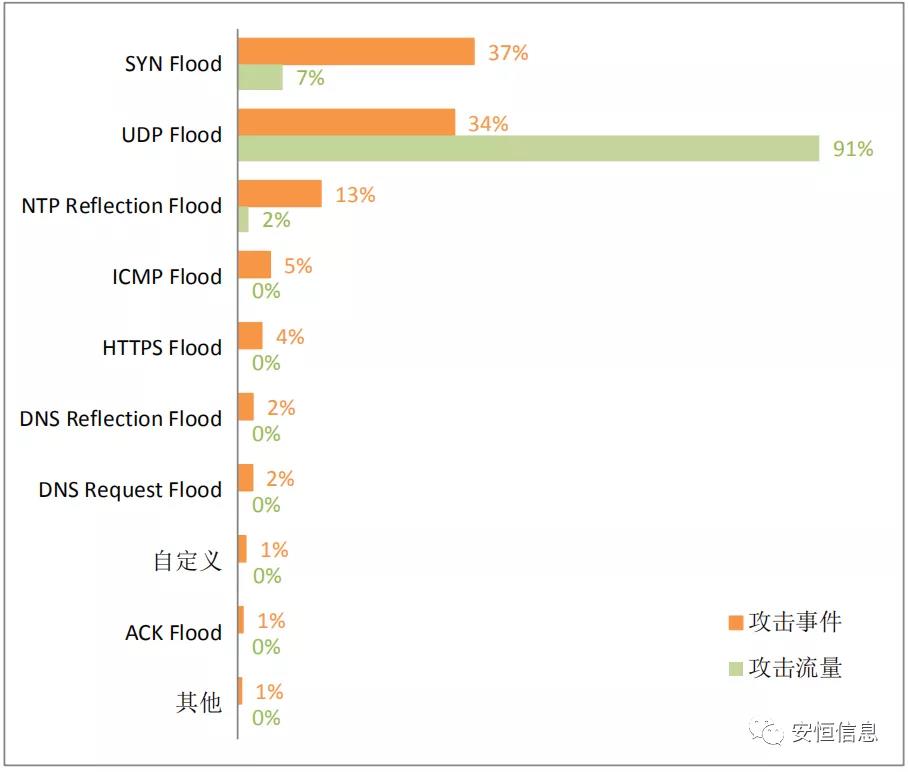 從攻擊類型來看,云端DDoS主要的攻擊類型是SYN Flood,占總攻擊次數(shù)的37%。從流量占比來看,UDP Flood發(fā)起的攻擊流量占比最高,占比91%。
