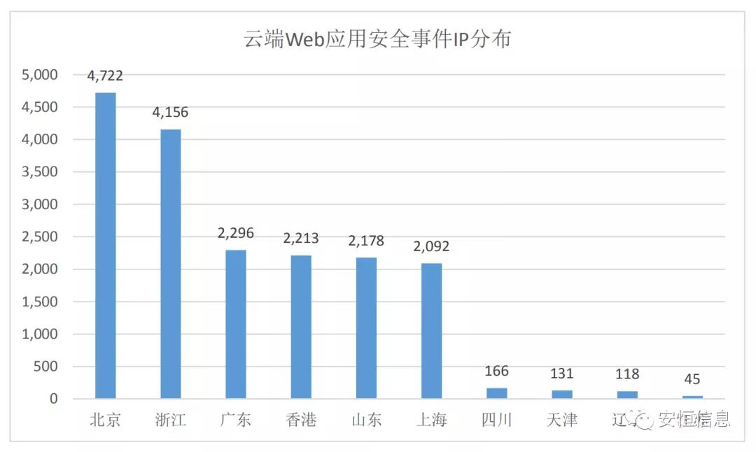 根據(jù)對存在安全事件的云端Web應(yīng)用IP所在區(qū)域進(jìn)行分析,發(fā)現(xiàn)主要分布在北京、浙江、廣東等區(qū)域。