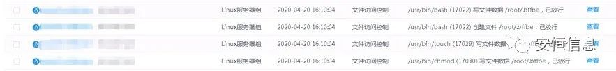 2、在該服務(wù)器上安裝安恒EDR客戶端,并在EDR管控中心開啟文件訪問控制,查看日志可以看到告警病毒文件/root/.bffbe被創(chuàng)建和改寫。