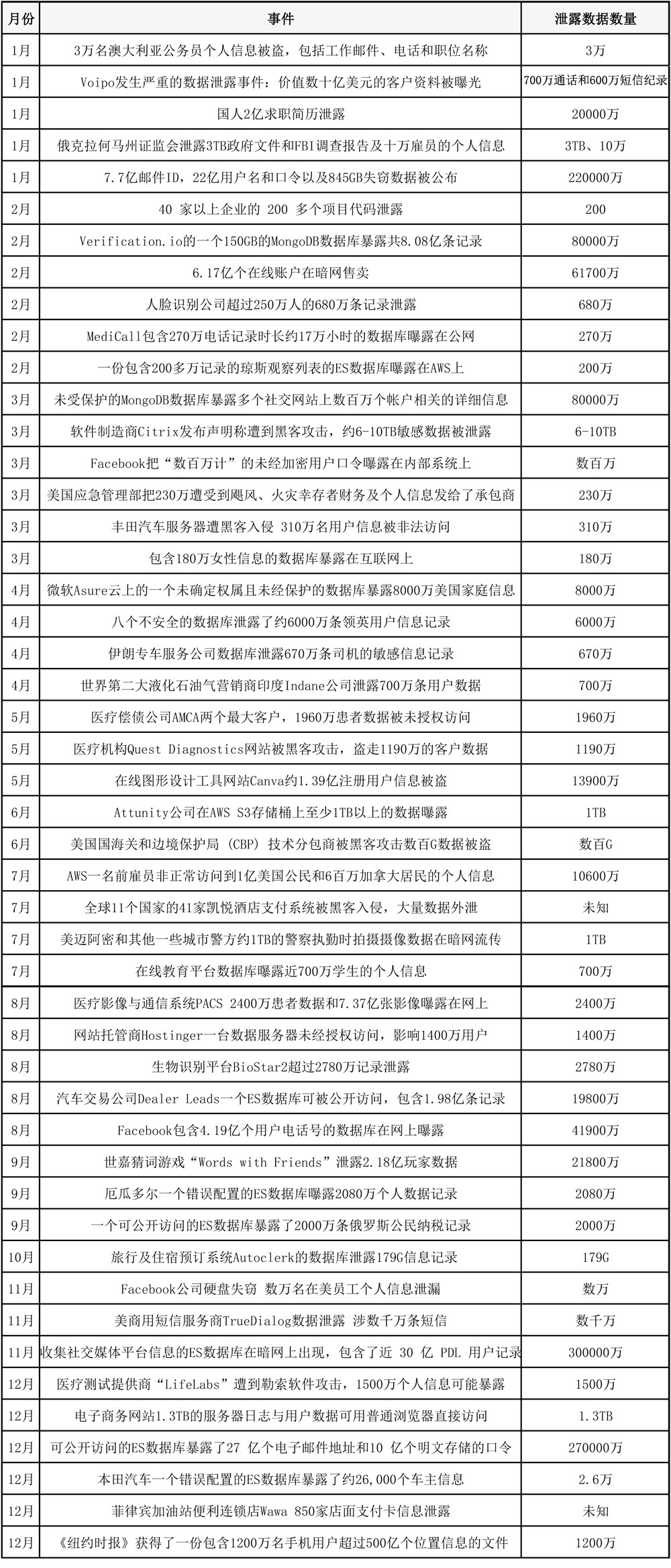 2019年典型性信息泄露事件一覽表