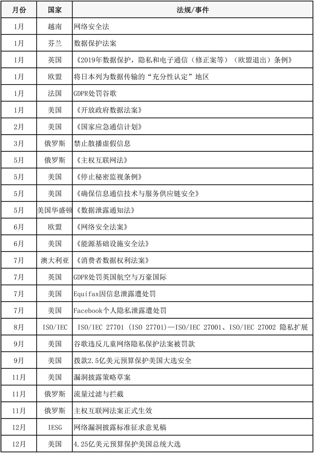 ?個(gè)人隱私、貿(mào)易保護(hù)、數(shù)據(jù)安全與國家安全為2019年全球各國家網(wǎng)絡(luò)安全相關(guān)政策法規(guī)的關(guān)注重點(diǎn)。網(wǎng)絡(luò)安全已經(jīng)深入到個(gè)人、企業(yè)、社會(huì)、政府等各個(gè)層面。