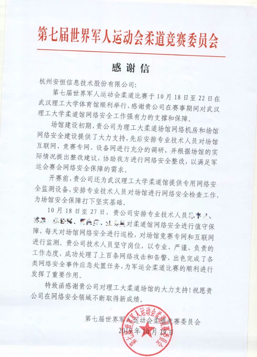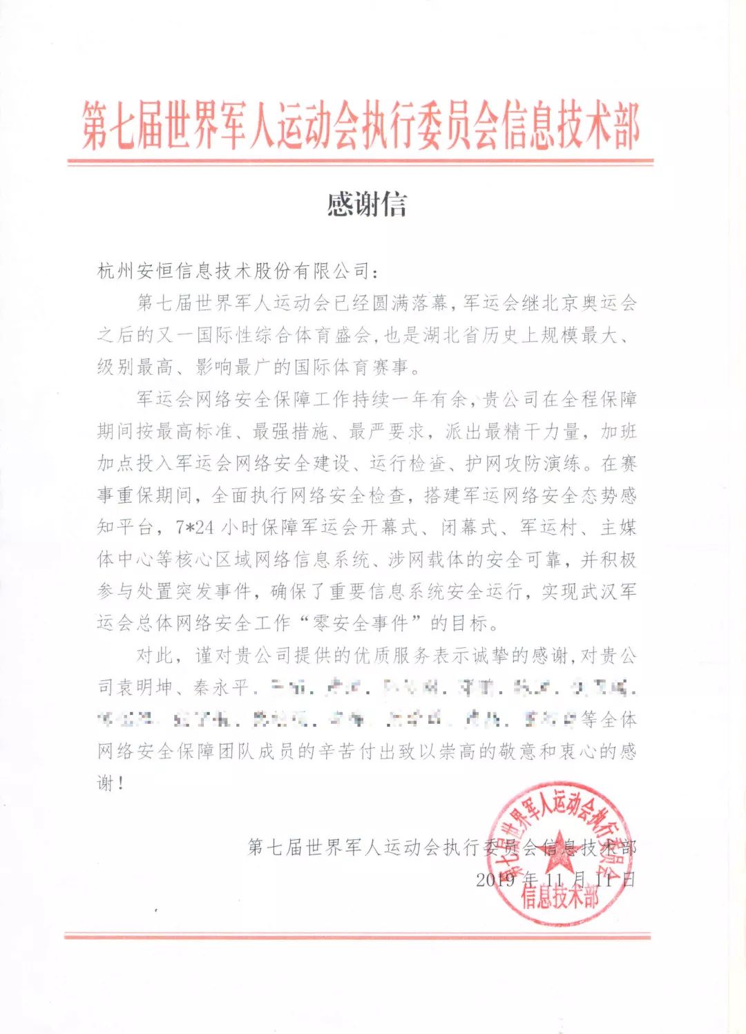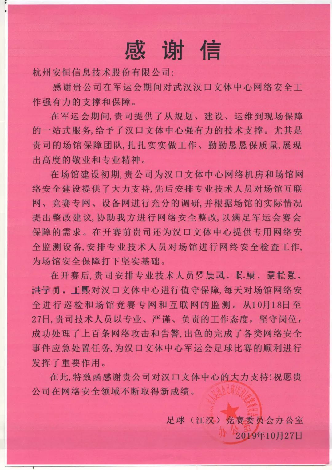 安恒信息收到了一波來自武漢軍運(yùn)會的感謝信
