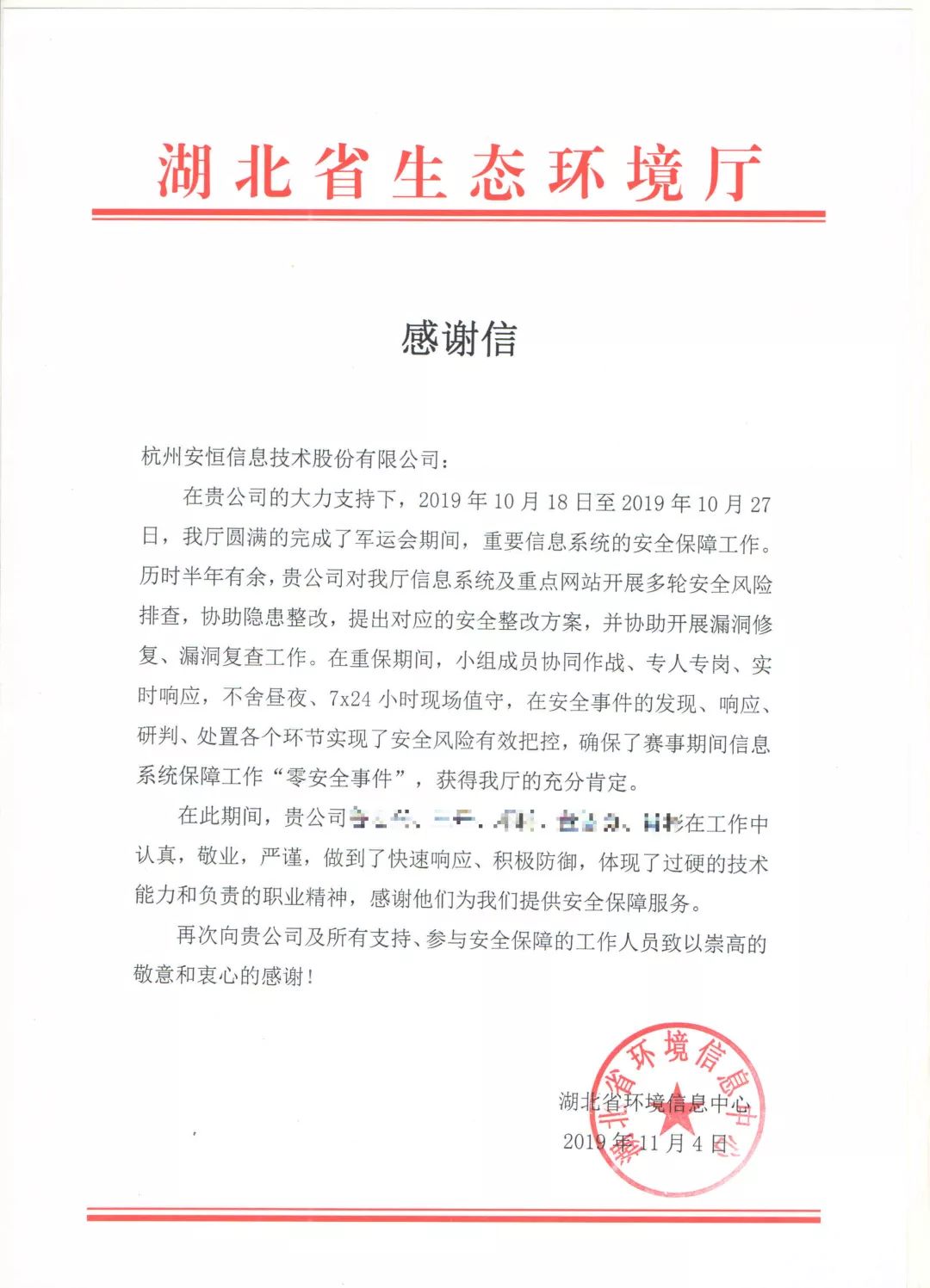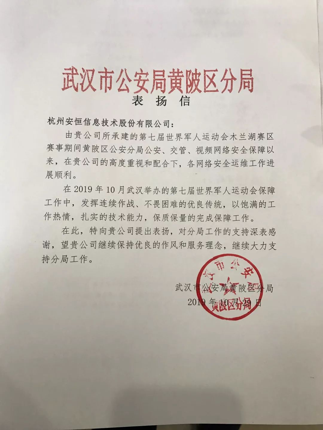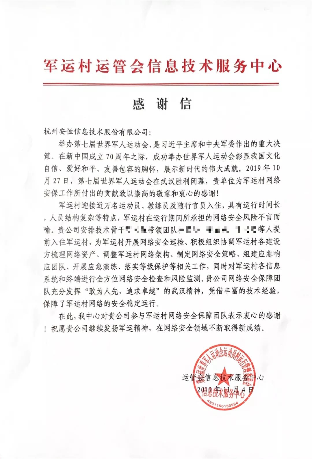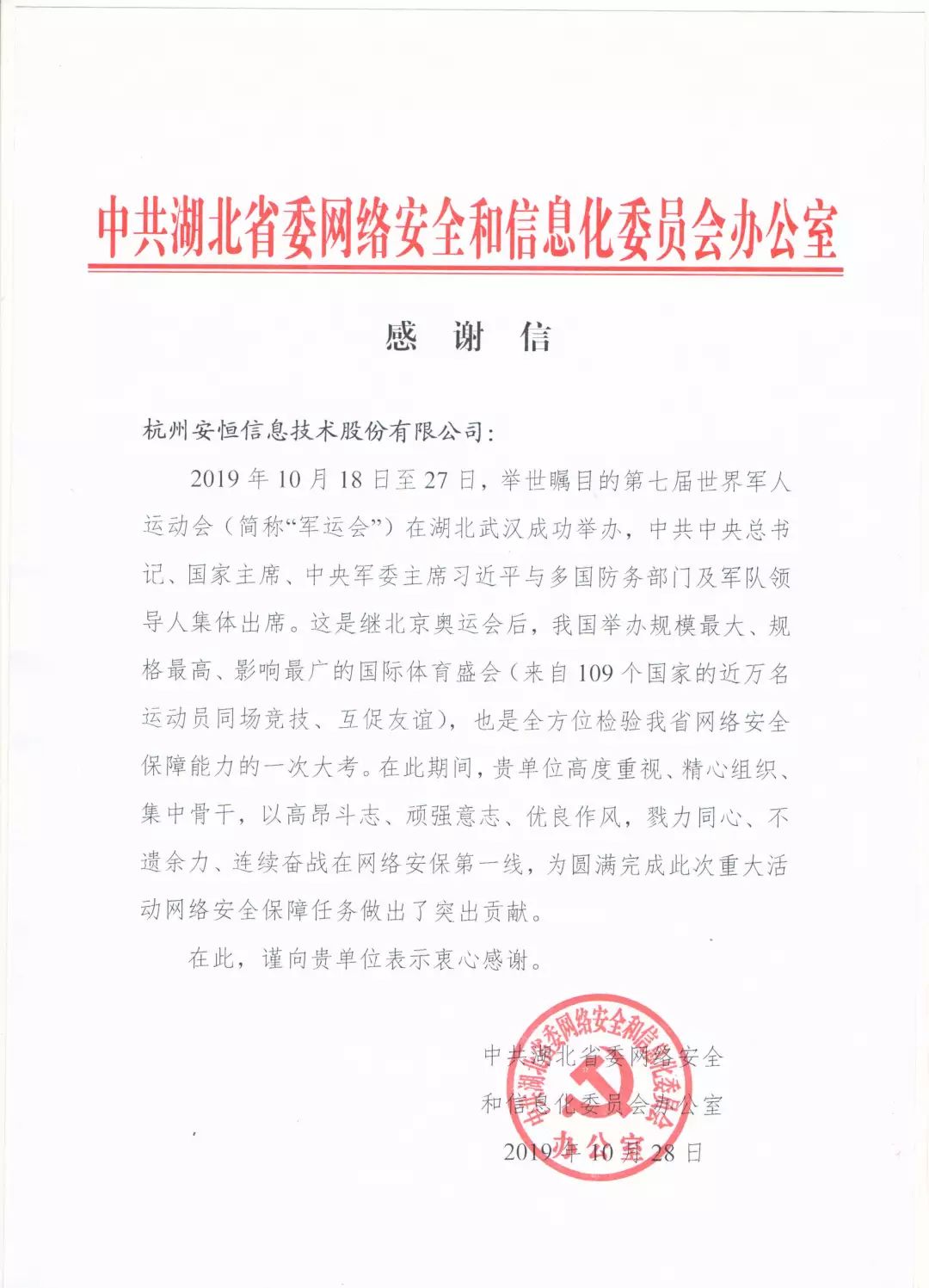 安恒信息收到了一波來自武漢軍運(yùn)會的感謝信