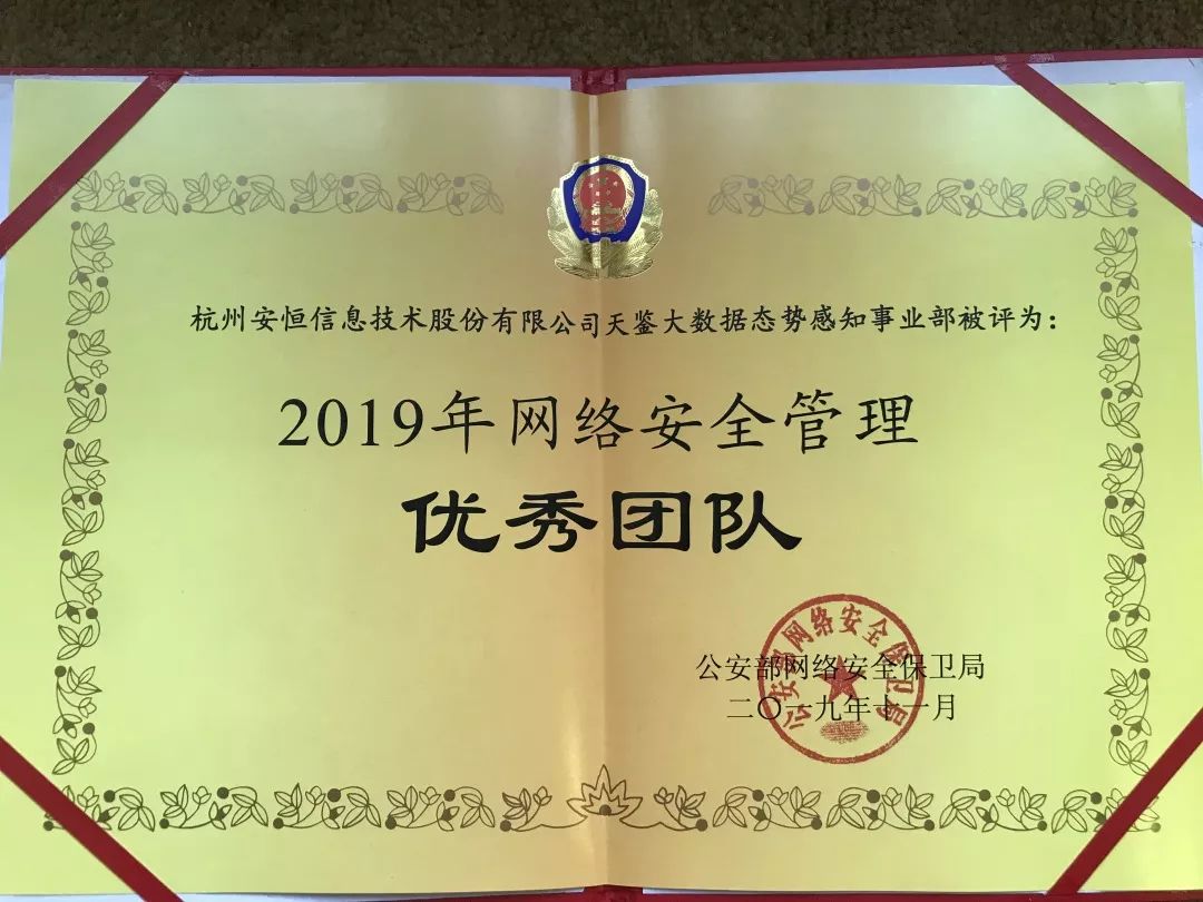 公安部授予安恒信息“全國(guó)互聯(lián)網(wǎng)企業(yè)網(wǎng)絡(luò)安全管理優(yōu)秀團(tuán)隊(duì)及個(gè)人”