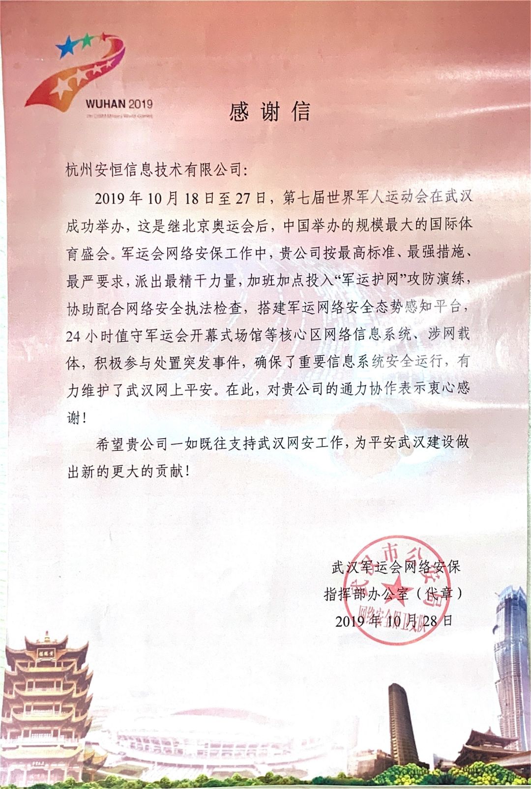 沒(méi)有網(wǎng)絡(luò)安全,就沒(méi)有國(guó)家安全。2019年,安恒信息天鑒大數(shù)據(jù)態(tài)勢(shì)感知團(tuán)隊(duì)在黃進(jìn)的帶領(lǐng)下,出色地完成了武漢軍運(yùn)會(huì)、第二屆進(jìn)博會(huì)、第二屆全國(guó)青年運(yùn)動(dòng)會(huì)等國(guó)家重大活動(dòng)網(wǎng)絡(luò)安保技術(shù)支撐平臺(tái)的保障工作。