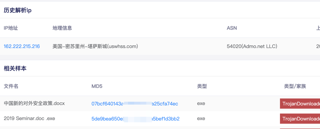 通過安恒文件威脅分析平臺檢索域名gongzuosousuo[.]net,又發(fā)現(xiàn)多個樣本,其中2個樣本引起我們注意: