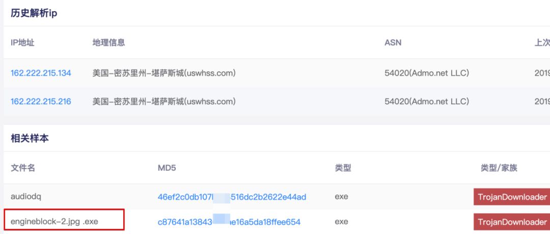 接下來,分析chm文件下載的ausetup.msi文件,它運(yùn)行后也會釋放叫“audiodq.exe”,其回連地址是:“l(fā)mhostsvc[.]net”,繼續(xù)使用平臺檢索該域名,發(fā)現(xiàn)叫做engineblock-2.jpg.exe程序