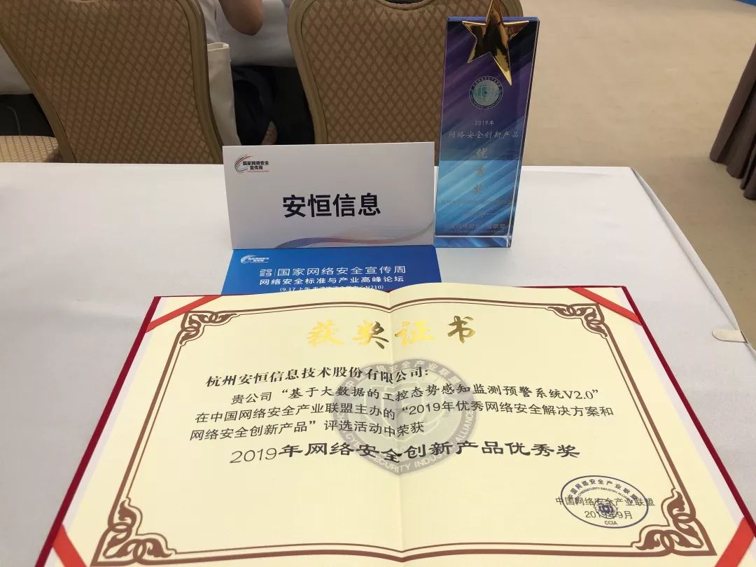 在今天的網(wǎng)絡(luò)安全標(biāo)準(zhǔn)與產(chǎn)業(yè)高峰論壇上,安恒信息“基于大數(shù)據(jù)的工控態(tài)勢(shì)感知監(jiān)測(cè)預(yù)警系統(tǒng)V2.0”、“網(wǎng)絡(luò)安全態(tài)勢(shì)感知通報(bào)預(yù)警與防御解決方案”分別榮獲由中國(guó)網(wǎng)絡(luò)安全產(chǎn)業(yè)聯(lián)盟所頒發(fā)的“2019年網(wǎng)絡(luò)安全創(chuàng)新產(chǎn)品優(yōu)秀獎(jiǎng)”、“2019年網(wǎng)絡(luò)安全解決方案優(yōu)秀獎(jiǎng)”,安恒信息首席安全官劉志樂代表公司上臺(tái)領(lǐng)獎(jiǎng)。