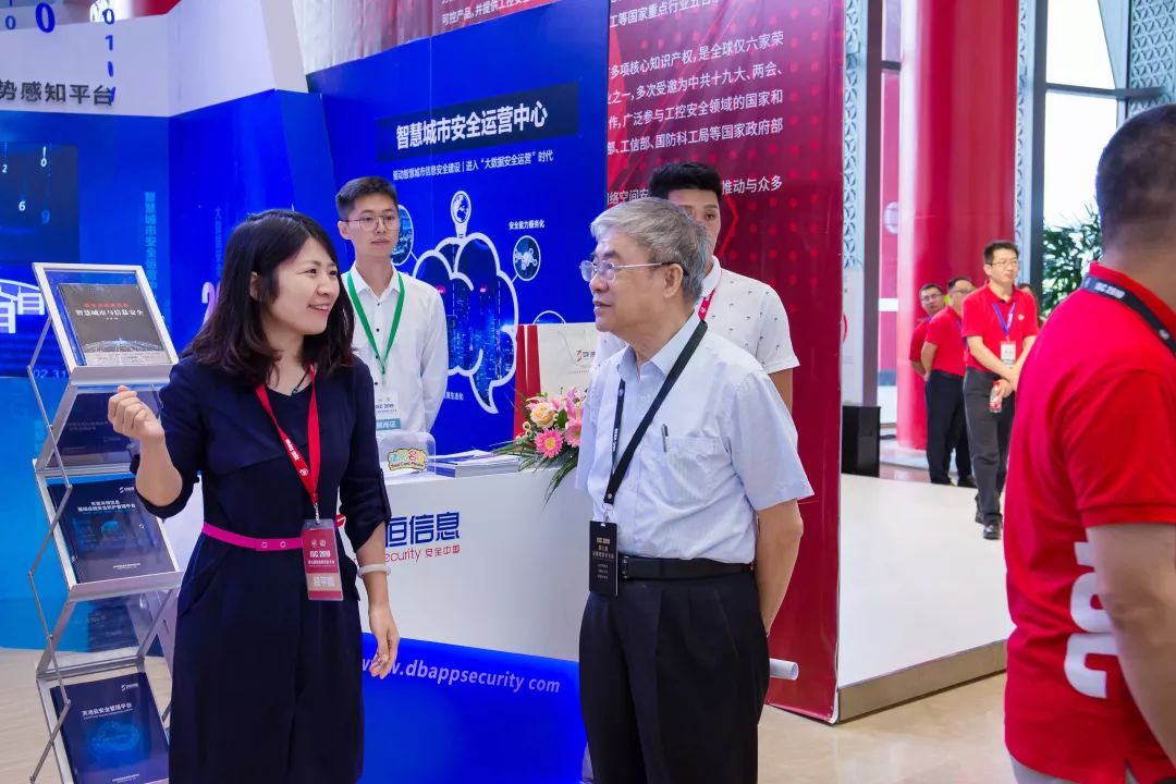 (圖:中國(guó)工程院院士鄔賀銓參觀安恒信息展臺(tái))