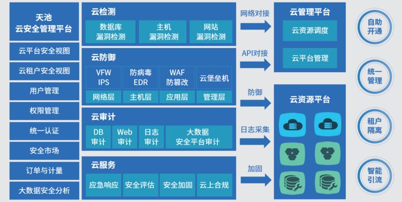 天池云安全管理平臺(tái)(以下簡(jiǎn)稱 “天池”)可對(duì)接兼容國(guó)內(nèi)外主流的云計(jì)算平臺(tái),結(jié)合安恒全線安全產(chǎn)品、不斷匯聚安全能力,打造云檢測(cè)、云防御、云審計(jì)、云服務(wù)等云安全體系,幫助用戶建設(shè)一個(gè)統(tǒng)一管理、彈性擴(kuò)容、按需分配、安全能力完善的云安全資源池。