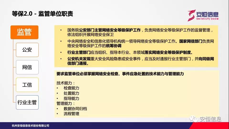 監(jiān)管單位作為督導(dǎo)部門,對信息系統(tǒng)網(wǎng)絡(luò)安全情況負有監(jiān)督、指導(dǎo)的職責。無論是《網(wǎng)絡(luò)安全法》還是《網(wǎng)絡(luò)安全等級保護條例(征求意見稿)》都講到公安、網(wǎng)信、行業(yè)主管部門要協(xié)作履行監(jiān)管職能。這就要求從技術(shù)能力與管理能力雙向提升,以滿足在等保2.0監(jiān)管過程中的檢查、處置、指導(dǎo)、協(xié)調(diào)、統(tǒng)籌等工作需求。