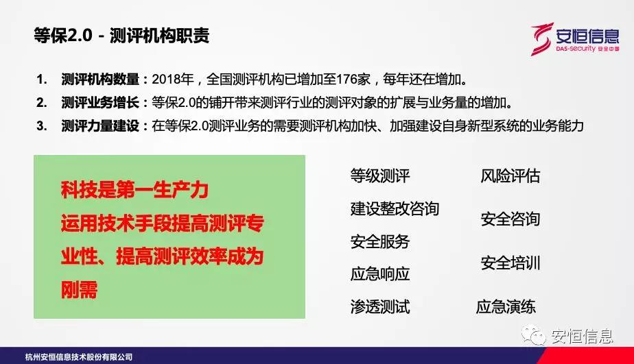 測評機構(gòu)是系統(tǒng)運營使用單位等保2.0建設(shè)情況的“裁判官”,必須對等保2.0涉及到的云計算、物聯(lián)網(wǎng)、工控等新型系統(tǒng)具備充分的業(yè)務(wù)能力。并且測評機構(gòu)一般還具有對外提供服務(wù)的業(yè)務(wù),這就要求必須加強自身對等保2.0的貫徹理解,才能更好對外提供服務(wù)。